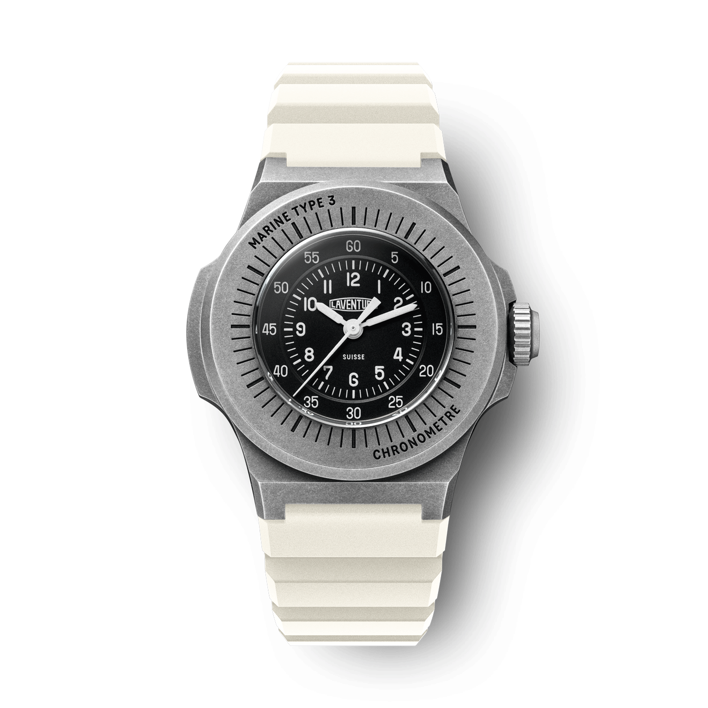 This MARINE TYPE 3 collection is an immersion in the 80s and its marine chronometers: technical precision instruments with dials, numerals and graduations of pure graphic design and exemplary legibility.